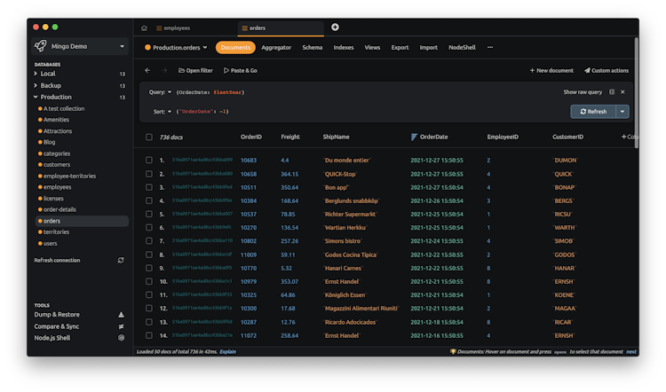 Mingo's NodeShell is a tool that helps businesses run JavaScript directly on their database. It is very helpful for updates or more complex operations. Or you can compare and sync different databases with Compare and Sync capabilities.