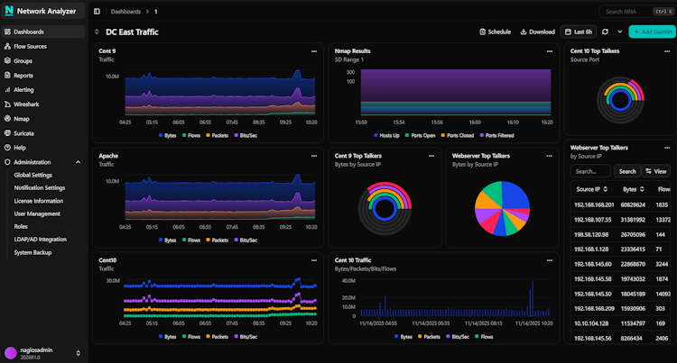 Nagios Network Analyzer is a NetFlow analysis, monitoring, and bandwidth utilization software. It provides instant access to vital NetFlow and sFlow data sources, server system metrics, and network anomalies, enabling swift network diagnostics and comprehensive tracking.