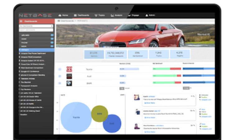 The NetBase platform processes millions of social media posts daily for actionable business insights for research, marketing, PR customer service, sales, and product innovation. NetBase offers businesses foresight and real-time social information to stay "in the loop" and fuel action for their brands. NetBase has partnerships with Walmart, American Airlines, Coca-Cola, Arby’s, Universal Music Group, Ogilvy, T-Mobile, and YUM! Brands.