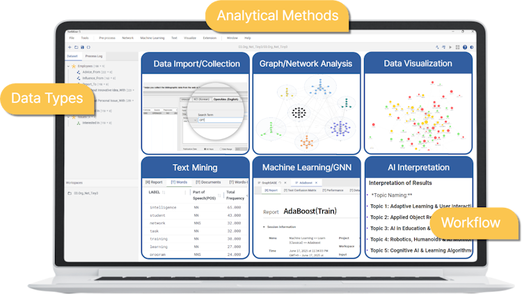 NetMiner 5, by CYRAM Inc., is a powerful platform for analyzing networks and text—no coding needed. It integrates SNA, machine learning, NLP, and AI in an intuitive workflow.