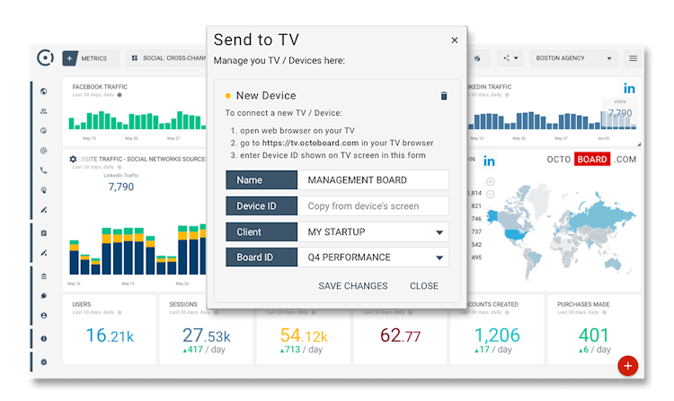 Through integration with office TVs or other devices, Octoboard for Business can be used as a real-time business control centre, and all dashboard displays can be remotely managed. Reports can be generated on metrics such as website sessions, sales, annual revenue, customer lifetime value, ad spend, social media traffic, and more. The Octoboard for Business platform provides users with a range of pre-built report templates which can be utilized and customized to create online marketing dashboards. All reports and dashboards are whitelabel so that users can customize them to align with company branding, and reports can be exported or shared with clients and other stakeholders via public links or by embedding into a business website.