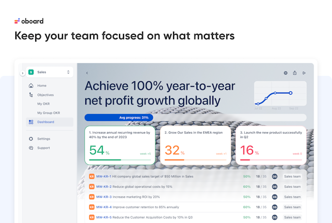 With Oboard you can easily start from the very top and establish the most critical strategic targets and goals, then break them down into OKRs for projects and teams within them.