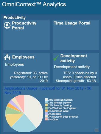 Complete analytics platform for workplace productivity and technology operations. It includes end-to-end data collection, integration, analysis and visualization. Omnicontext enables organizations to use digital technology operational data for in-depth organizational intelligence, such as work culture, engagement, technology adoption, or efficiency analysis. Technology departments gather and access critically important information on real-time status, quality, and usage of their on-premise and cloud services across the enterprise.