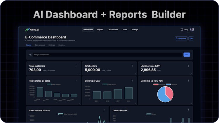At the same time, Onvo is built for modern SaaS and B2B companies that want to give their customers access to meaningful insights directly inside their own products. With Onvo’s embedding capabilities, you can integrate AI-powered dashboards seamlessly into your platform, offering analytics as a built-in feature without additional development or infrastructure costs.