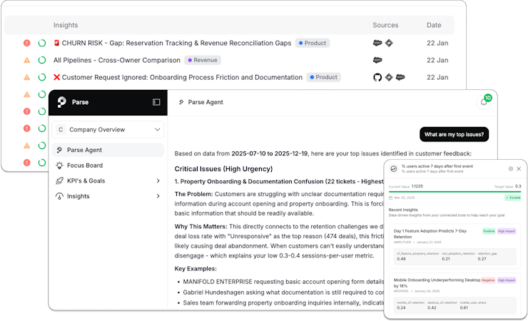 Parse is an AI-powered revenue intelligence platform built for software as a service companies seeking to uncover hidden churn risks, revenue leakage and expansion opportunities across their technology stack. The platform operates as an autonomous agent system that continuously monitors and analyzes data from multiple business applications to detect critical issues that traditional business intelligence dashboards fail to surface. Parse addresses the green dashboard paradox in which departmental metrics appear healthy while underlying systemic issues threaten revenue performance. The solution is designed for high-growth software as a service organizations that require cross-functional visibility between commercial operations and technical execution.