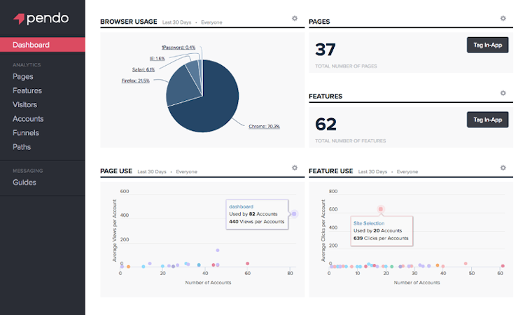 Pendo is a product experience platform for teams to capture product usage data and behavior, gather feedback, and influence behavior with in-app messaging. By providing users with the tools to analyze their customer usage, organizations can see which features drive engagement and target segmented groups, enhancing their customer experience.