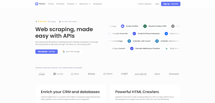 Are you looking for something robust? Something that can scrap the web? Then Piloterr is the way to go! Discover the best of the best web scraping API and data management platform out here. Use pre-built crawlers and streamlines valuable marketing & sales information wherever you want it. Ranging from Google, LinkedIn, and Shopify to custom API endpoints (company data enrichment, email checker), teams will surely find the dream within its wonderful catalog.