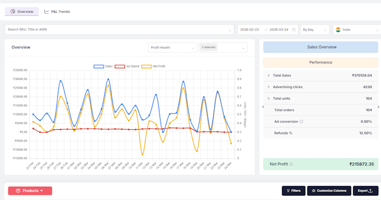 The platform delivers detailed profit analytics through specialized modules that address critical aspects of Amazon seller operations. The profit trends module enables monitoring of financial performance over time and supports identification of patterns in revenue and expenses across different periods. The cost of goods sold management functionality permits tracking and updating of product costs at the individual SKU level to ensure accurate margin calculations. Inventory management features provide visibility into stock levels and associated carrying costs to support optimization of reorder points and avoidance of stock imbalances. The expense management module consolidates Amazon fees, advertising spend, returns and operational expenses into a unified view. Performance alerts issue notifications when key metrics deviate from expected ranges. An AI powered co pilot facilitates natural language queries of financial data to accelerate access to insights without manual report generation. Customizable dashboards offer interactive visualizations that can be filtered and sorted according to business requirements while exportable reports enable sharing of insights in multiple formats including PDF and Excel.