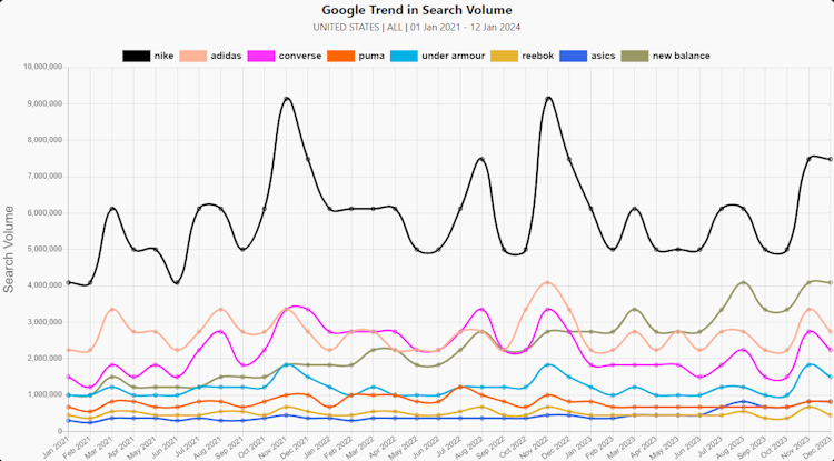 Users can generate charts showing Google search interest trends for entered brands or topics in any country or worldwide. Businesses can access daily trends in search volumes and % share of search for any list across multiple brands or topics in any country. It allows teams to view the monthly volume of Google searches and % share of search for up to 100 brands/topics at a time in any country. It includes seasonality heatmap functionality.