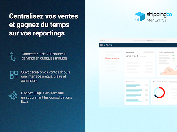 In just a few clicks, you can connect your marketplaces, CMS and ERP systems and access key indicators to drive your commercial strategy. Adjust your offers and boost your margins. Deployed in less than 15 minutes, Shippingbo Analytics replaces fragmented reporting, manual Excel exports and blind decisions.