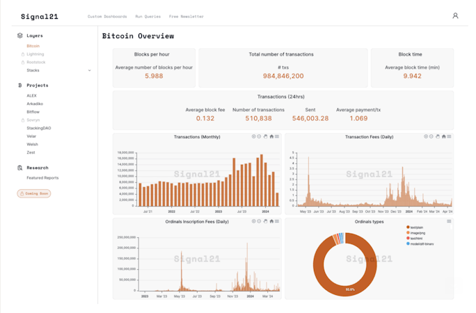 Signal21 provides institutions and individuals with comprehensive Bitcoin research and data, encompassing Layer 1, Layer 2, Dapps, all in a single platform. This enables success in trading, risk management, and research within the Bitcoin Economy.