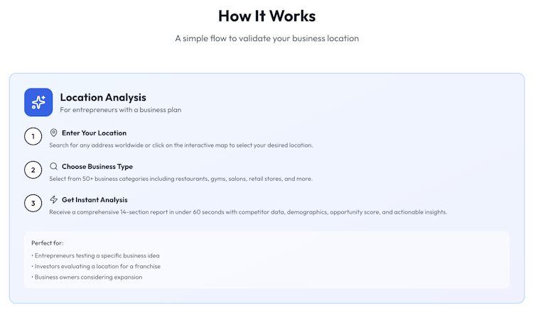 The platform features fifteen analysis sections in each report. It includes real competitor data drawn from the Google Maps API for all competitors within a three-kilometre radius, presenting names, ratings, review counts, and price levels. It generates a zero-to-ten viability rating for quick assessment of location suitability. The system delivers demographic insights covering population size, income levels, and market trends, as well as foot traffic analysis detailing weekly activity patterns. It offers a SWOT framework to identify strengths, weaknesses, opportunities, and threats. Financial projections are provided with revenue estimates, startup cost breakdowns, break-even analysis, and rent predictions. The reports also include sentiment analysis of the chosen area and a business setup guide outlining legal compliance, permits, hiring processes, supplier selection, and marketing steps. An AI chat assistant enables users to query the report and receive tailored guidance based on the analysis.