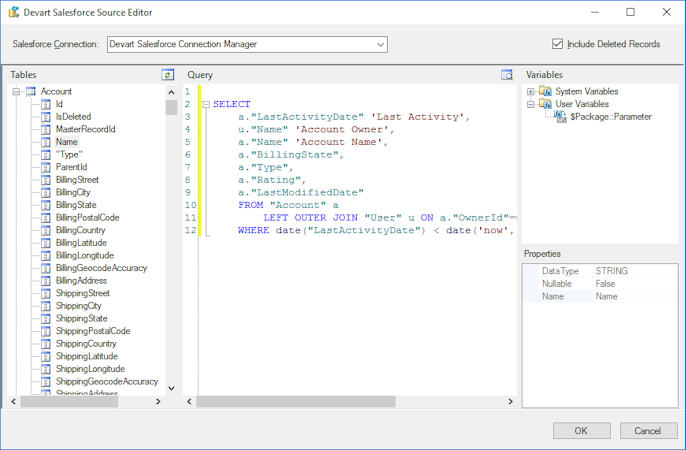 Devart SSIS Source components come with convenient and user-friendly editor that visually displays the corresponding source objects and SSIS variables.