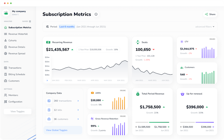 Subscript allows B2B SaaS finance leaders to dive deep into data and uncover hidden insights with just a few clicks. Teams get instant access to all B2B SaaS data so they can quickly and easily assess the business’s health. A simple drop-down menu lets managers filter data by any attribute. Subscript lets teams understand how ARR varies based on customer size, customer churn is different from state to state, and the LTV for customers changes based on the product they use
