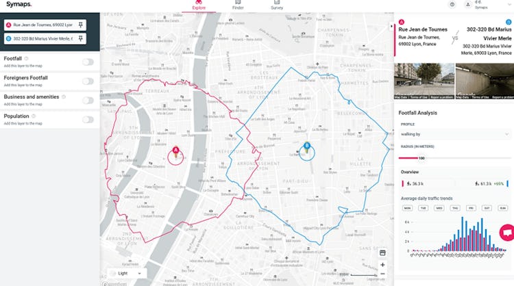The platform combines various types of location data (socio-demographics, footfall, business & amenities, private data), Symaps' users can :