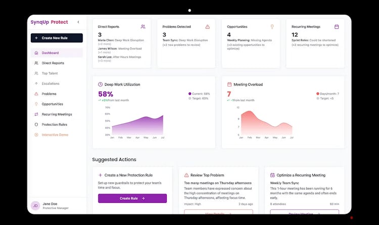 SynqUp is an enterprise-grade platform built to address meeting inefficiencies at scale. It integrates with calendar systems to analyze organizational meeting patterns using AI detectors that flag behaviors associated with meeting overload, redundancy, and lack of preparation. These insights are used to deliver real-time coaching nudges, helping improve individual and team practices.