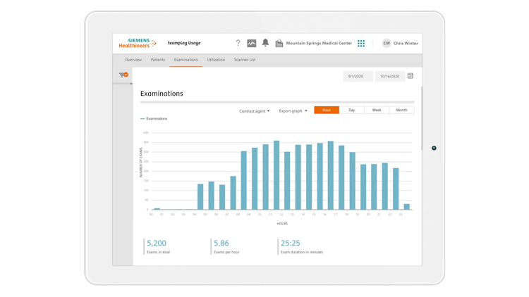 teamplay Usage is a cloud-based data analysis platform from Siemens Healthineers that helps radiology departments track medical equipment productivity and usage on a centralized interface. This solution enables users to gain a transparent view of radiology department processes, displaying key performance indicators (KPIs) for device utilization. teamplay Usage helps radiology teams leverage equipment efficiently, improve patient throughput, and lower operational costs. Generate calculation of important KPIs, detailed information about scan protocols, and group devices based on location or type for benchmarking against peers. Additionally, it also helps optimize dose management and improves the bottom line for clinical teams.