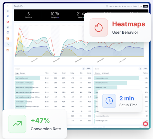 • Uncover friction points instantly using dynamic heatmaps that visualize clicks, scroll depth, and user focus areas—no setup required, and updated continuously.