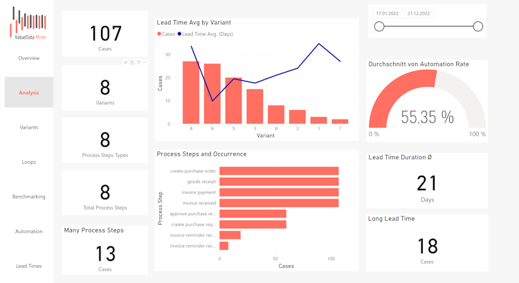 Uncover the digital traces left by crucial business processes and present them visually within Microsoft Power BI. Identify bottlenecks and inefficiencies, such as manual tasks, and gain insights into their origins.