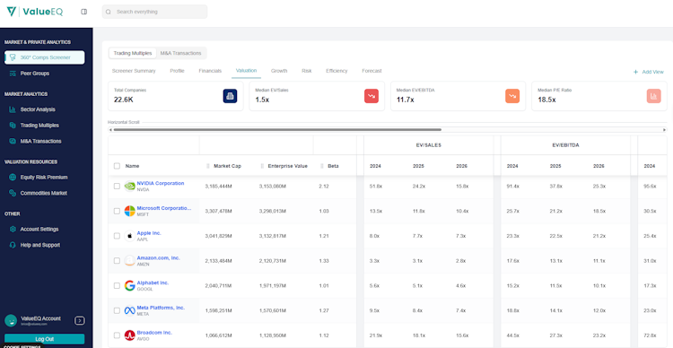 ValueEQ is an AI-powered valuation platform built for finance professionals who need instant access to institutional-grade data and tools without the inefficiency of legacy solutions. With 60,000+ public company comps, 60,000+ M&A deals parsed daily, and an end-to-end suite of valuation tools (WACC, DCF, multiples, and more), ValueEQ empowers analysts, consultants, and investors to deliver insights with speed, accuracy, and defensibility.