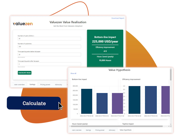 Valuezen's AI-powered Value Copilot acts as a personalized value advisor, facilitating value-centric conversations with customers. Trained on a vast B2B SaaS ontology, the Value Copilot recommends personalized value models and crafts dynamic value maps to ensure every customer interaction positions the unique value proposition. The Value Realization Platform allows users to upload or create custom value models aligned with each customer persona, defining the crucial value metrics and levers. These models are then transformed into interactive calculator widgets, elevating conversations through value hypothesis and what-if analyses.