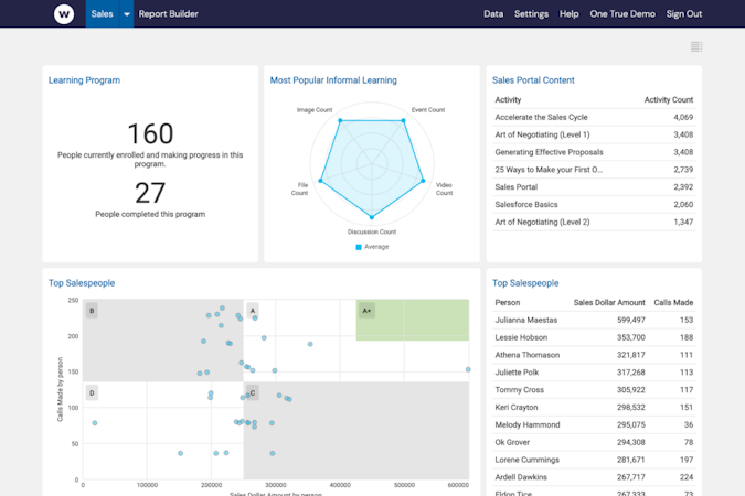 Watershed facilitates integration with various third-party platforms such as Slack, Jive, Alchemer, Degreed, Articulate 360, Credly, DigitalChalk, and more. It provides a reporting solution, which enables managers to visualize data in the form of bar charts, pie charts, or heat maps and gain insights into program’s milestones and progress via analytics, graphs, and KPI metrics.