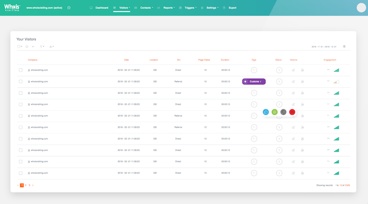 Whoisvisiting automatically alerts users of qualified leads based on company journeys, such as length of browsing time or landing page visited. These notifications allow users to follow-up with interested leads in a timely manner. The visitor engagement bar scores leads based on the number of key pages visited and time spent on site to visualize the most engaged visitors, enabling informed prioritization. Visitor actions can be used to apply advanced filters to visitors, group leads into custom categories, distribute hot leads, update deal statuses, and more.