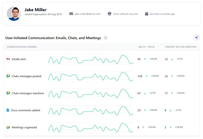 The platform delivers dozens of automated insights by analyzing Google Workspace usage logs without requiring access to sensitive content data. It generates comprehensive usage reports across multiple applications including Gmail activity tracking, file sharing analysis in Google Drive, attendance and duration reporting in Google Meet and usage metrics for Gemini. An activity dashboard provides granular visibility into application interactions and enables identification of usage patterns, collaboration trends and productivity metrics. The system operates automatically with no manual data input by collecting and processing usage log information to generate insights. Installation is executed through the Google Workspace Marketplace and requires Google Workspace admin permissions for deployment. Role based access controls restrict data access to authorized users within the organization.