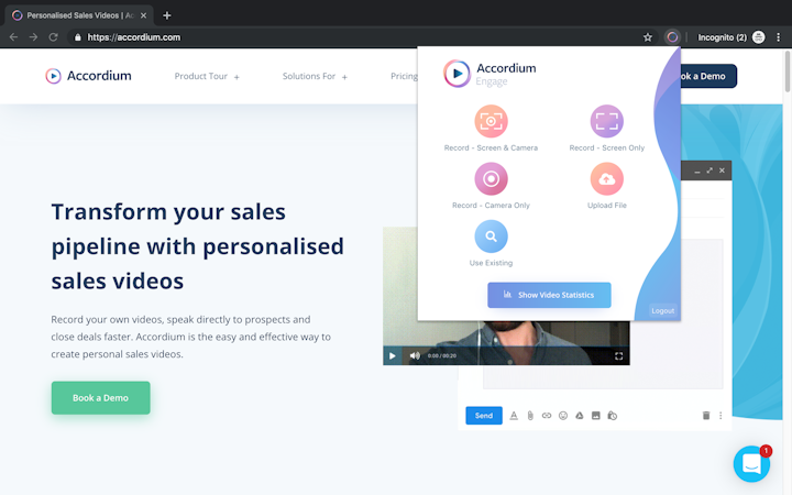 Send videos directly from Gmail with the dedicated Accordium plug-in, or record in your web browser using the Google Chrome extension to capture your screen or yourself. Use Accordium to stand out in a crowded market, to get noticed in inboxes and to improve engagement with new prospects and existing customers.