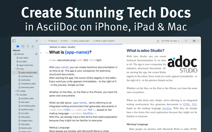adoc Studio is a powerful and intuitive writing environment designed for technical writers, authors, and documentation enthusiasts. The application offers a comprehensive set of features to streamline the creation of structured texts across Mac, iPad, and iPhone platforms.
