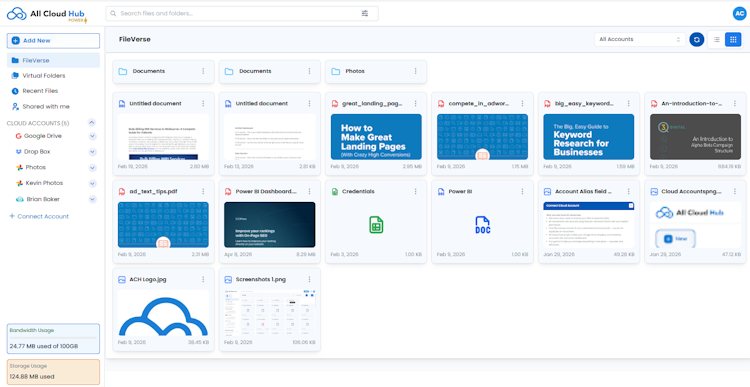 - All Cloud Hub is a powerful platform designed to simplify how you manage multiple cloud storage accounts in one place. It supports integrations with Google Drive, OneDrive, Dropbox, Google Photos, and pCloud.