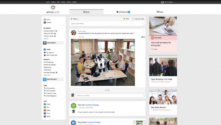 Alma Suite is a cloud-based platform which combines a private social network and knowledge base with tools for employee training, task management, idea generation, internal communications, and more. The software is designed for medium-sized companies, non-governmental organizations (NGO) and nonprofits, benefit corporations, educational institutions, and healthcare organizations.
