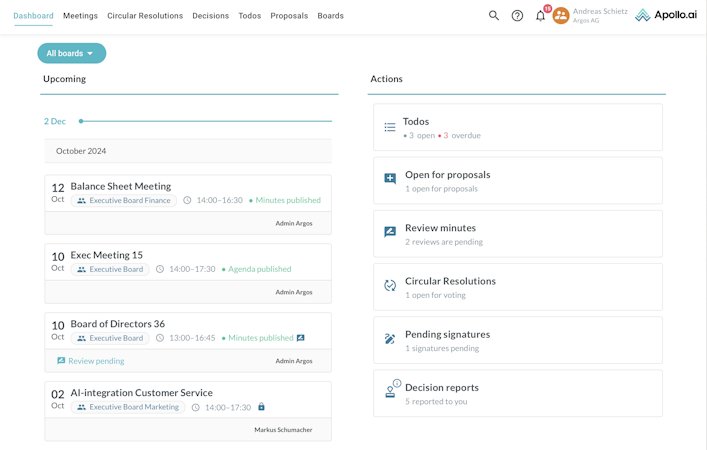 Apollo.ai is a cloud-based board, meeting, and decision management software designed for industries, such as energy, manufacturing, finance, public sector, and consulting. The platform helps optimize meeting productivity by enabling executive and supervisory boards to collaborate, unlock intelligent decision making, and track optimal results.