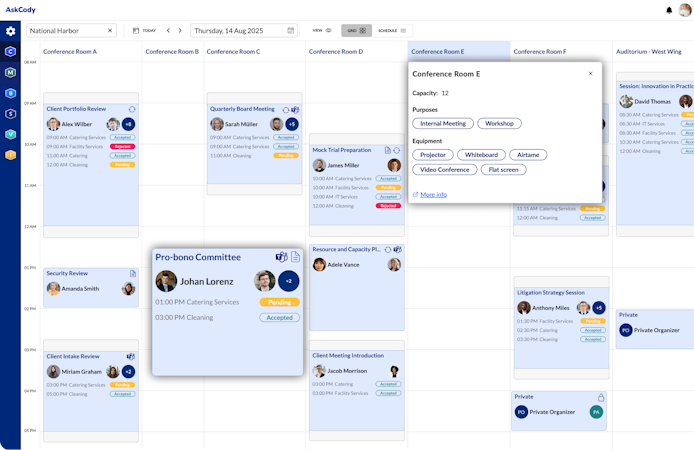 With AskCody, employees can quickly find and book the right meeting space, request catering or AV services, and manage attendees, all from interfaces they already know.