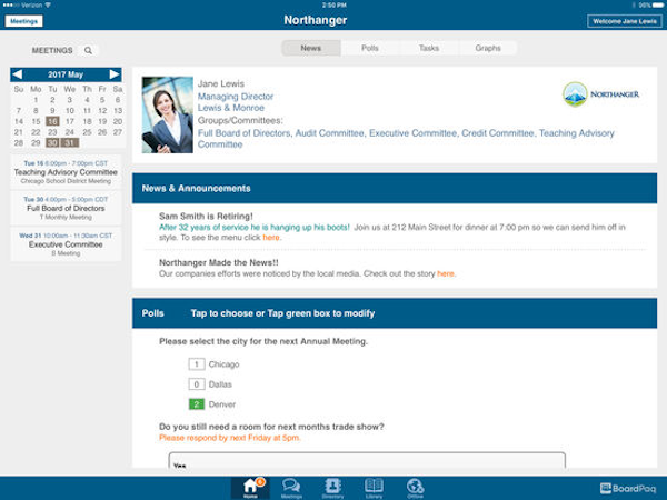 The BoardPaq Board Apps for iOS, Android, Windows, and Chromebook, as well as desktop access, allow users to manage their board meetings on-the-go, and make notes electronically during meetings. Board members are able to login to the self-service portal and see news and announcements, upcoming meetings, assigned tasks, and more, as well as access meeting agendas alongside supporting documents, agenda item notes, related discussions, and more. The meeting calendar facilitates the scheduling of board meetings, with users able to see the availability of others and create RSVPs.