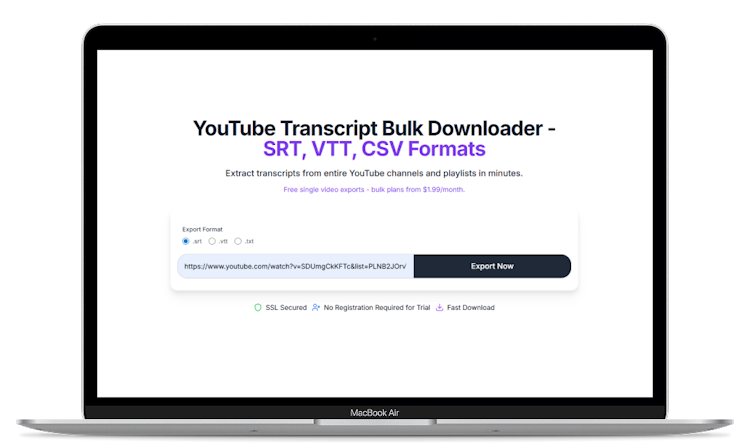 ClipTranscribr converts YouTube transcripts into downloadable SRT, VTT, TXT, and CSV files. Users can automatically extract captions from individual videos or batch-process entire playlists and channels. Teams can access multiple export formats such as SRT and VTT (timestamped subtitle files), TXT (plain text with/without timestamps), CSV (spreadsheet-ready data).