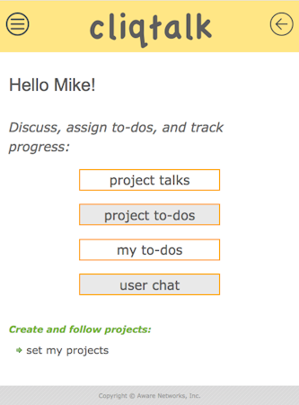 Cliqtalk is a mobile-first solution designed to allow users to share project discussions, to-dos, and team workload. With Cliqtalk, users can track projects, post new messages, exchange private messages, or vote on issues in discussions. Cliqtalk allows users to manage project hierarchies, assign to-dos lists, and track user workload.