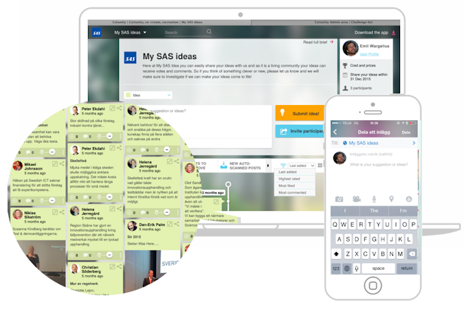 With Co:tunity, users can capture and develop ideas, spot trends and find problems. In order to develop ideas, users first create questions and briefs from which to incite inspiration. Users can invite participants with email invitations or push-notifications and control the level of engagement of participants by determining whether individuals can create posts, analyze or start their own challenge. Co:tunity allows participants to share ideas using images, videos, links and documents and encourages continuous collaboration with comments, votes and chat conversations.