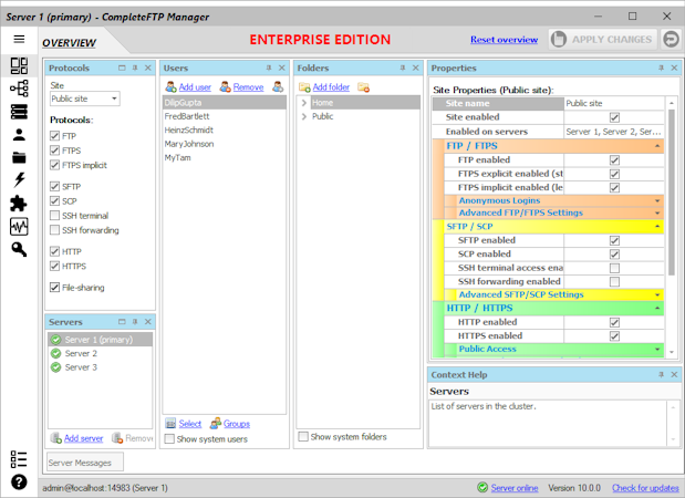 FTP, FTPS, SFTP, SSH, SCP and HTTP/HTTPS protocols, Secure file-sharing, Clustering, Protocol translation, Customization and much more. Covering a range of industries including Retail, Government, Healthcare, Banking/Finance, Aerospace, Telecommunications, Defence, Legal and many more. Suitable for small, medium and large enterprises - with specific editions to grow with your business.