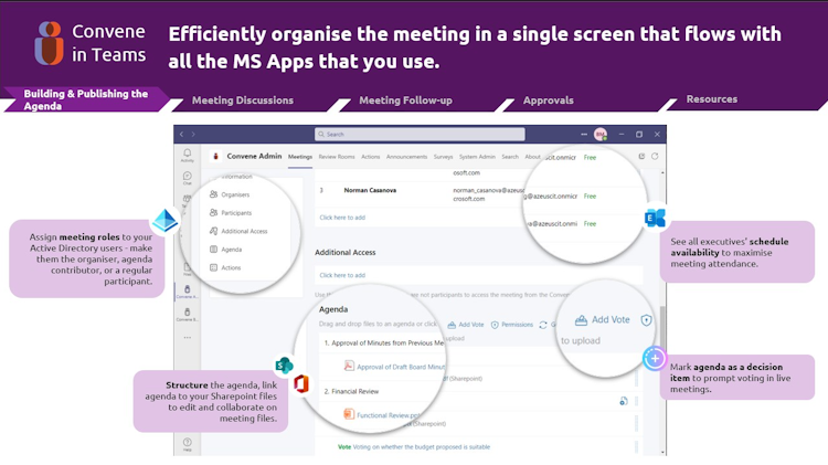 Convene in Teams (CiT) is a board companion for MS Teams, seamlessly integrating with Microsoft Applications for a smooth meeting experience. It enables administrators to boost productivity, drive effectiveness, and steer compliance throughout and beyond the meeting cycle.