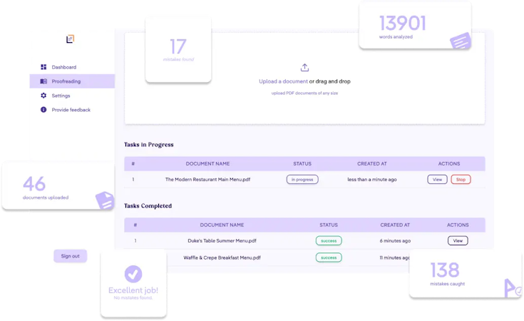 Correctify is a cloud-based proofreading tool that helps businesses check spelling errors in restaurant menus. With Correctify, users have access to a centralized dashboard that displays all the past uploaded documents and the mistakes that were identified.