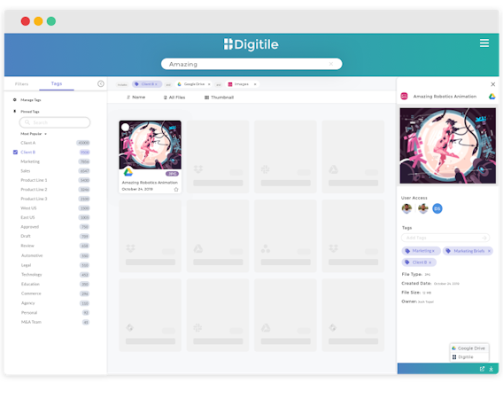 Digitile is the market-leading Digital Asset Management platform for Google Drive and Dropbox. With intuitive tag management capabilities and AI technology, teams can organize their Google Drive and Dropbox shared files with tags. Purpose-built for the entire organization with tag management permissions, bulk tagging, and universal team tags to help employees quickly and easily find any document and file type.