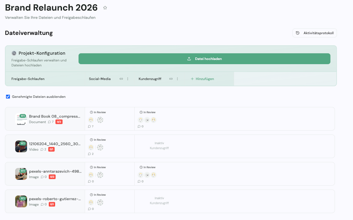 Approval workflows follow a structured four step process that begins with file upload and project organisation and continues with definition of approval loops, collaborative review and final approval. The platform offers multi stage approval loops supported by automatic notifications, secure link sharing for external partners without registration and full version history with comparison capabilities. Role based permissions and centralised file management maintain project integrity and support collaboration across distributed teams.