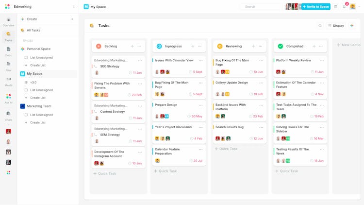 Organize work with list and kanban views, agile sprints, assignees, due dates, estimates, subtasks, tags, and cover images. Keep every conversation in context. Chat privately, by task, by team space, or in a meeting room. Start a built in video call in one click.
