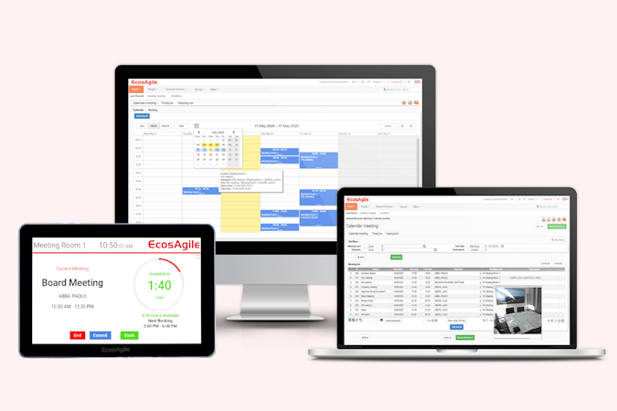 EcosAgile eMeeting is a tool for managing and booking meeting rooms, shared workspaces, and coworking spaces to precisely plan business meetings and activities. It provides a clear, real-time overview of the availability and characteristics of each room, allowing organizers to quickly book the most suitable space for their needs. The 8-inch touch screen device can be easily installed near the meeting room and communicates in real-time with the EcosAgile Cloud system.