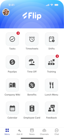 Flip turns disconnected frontline teams into engaged, empowered contributors. A new hire can receive their welcome messages, onboarding tasks and training automatically. A manager can push out urgent updates in seconds. An employee can ask AI about the sick leave policy, get the right answer and have the time booked off in an instant. Everyday moments become everyday wins.