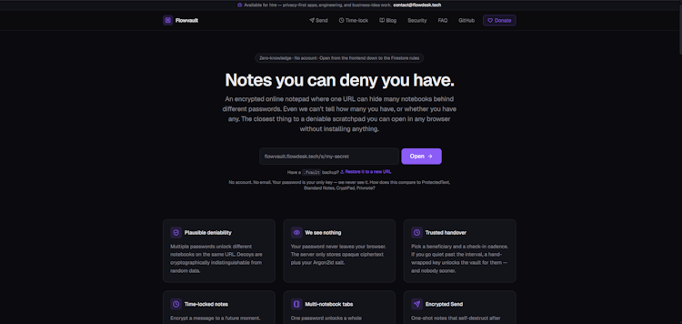 Flowvault is a zero-knowledge encrypted notepad application that provides browser-based note taking with client-side encryption and plausible deniability capabilities. The software operates without requiring user accounts or email addresses and positions itself as a privacy-focused alternative to similar solutions. Notes never leave the browser in plaintext and multiple passwords can unlock different notebooks on the same web address. Observers and service operators cannot determine how many notebooks exist or whether any exist at all.