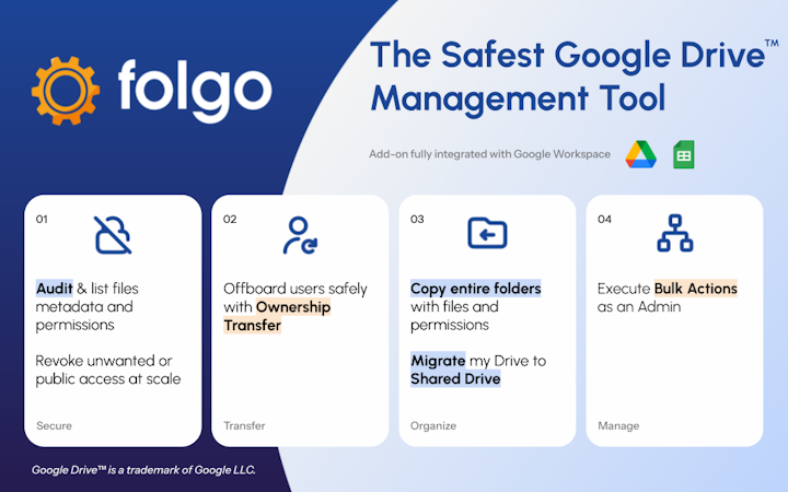 Folgo is a secure and efficient Google Drive™ management add-on designed for Google Workspace admins and users. It offers robust tools to manage, secure, control your Drive content effortlessly at scale.