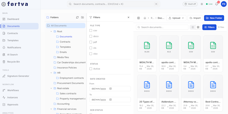 Fortva is a cloud-based platform that combines document management (DMS) and contract lifecycle management (CLM) into a single system designed to help businesses organize, control, and manage documents and contracts efficiently. It provides a centralized workspace where teams can store, access, and manage files across departments, reducing fragmentation and improving visibility. Fortva supports the full lifecycle of documents and contracts—from creation and collaboration to approval, execution, and storage—within one environment.