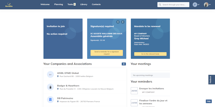 Gov&Go is a solution for efficient and impactful corporate governance. The platform centralizes the management of boards, shareholders, and strategic meetings, ensuring decisions are signed according to voting rights and best practices. It provides access to templates of agendas and minutes validated by legal experts, guaranteeing no legal deadlines or compliance dimensions are missed.